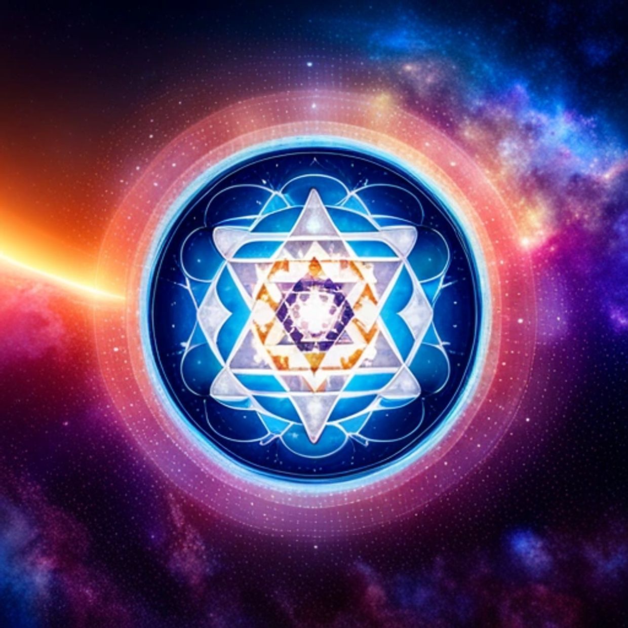 The Sri Yantra is a 2-dimensional geometric figure that is composed of nine interlocking triangles that radiate out from a central point. It consists of 43 smaller triangles, in five concentric levels, representing the cosmos and the human body.